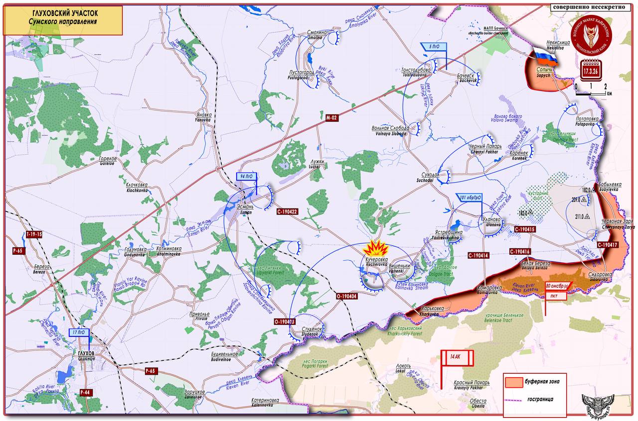 На севере Сумской области (условно Глуховский участок) продолжаются боевые действия в приграничной полосе, 17 марта был установлен контроль над н.п. Сопычь (51°5054 с. ш. 34°2143 в.д. - население в 2025 году 22 чел.). Расположен данный населенный пункт на правом берегу р. Клевень, по руслу которой проходит государственная граница с РФ.