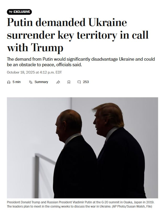 Со своей стороны отметим, что сливы о требованиях России по выводу ВСУ из Донбасса, как условия для остановки боевых действий, многократно звучали (1, 2, 3, 4) еще по итогам встречи Путина и Трампа на Аляске. Тогда еще заявлялось, что Россия также якобы готова обсуждать вывод ВС РФ с территории Харьковской и Сумской области. Российские власти подобные идеи "обмена" не подтверждали и не опровергли, Украина же публично отказалась от данного предложения.