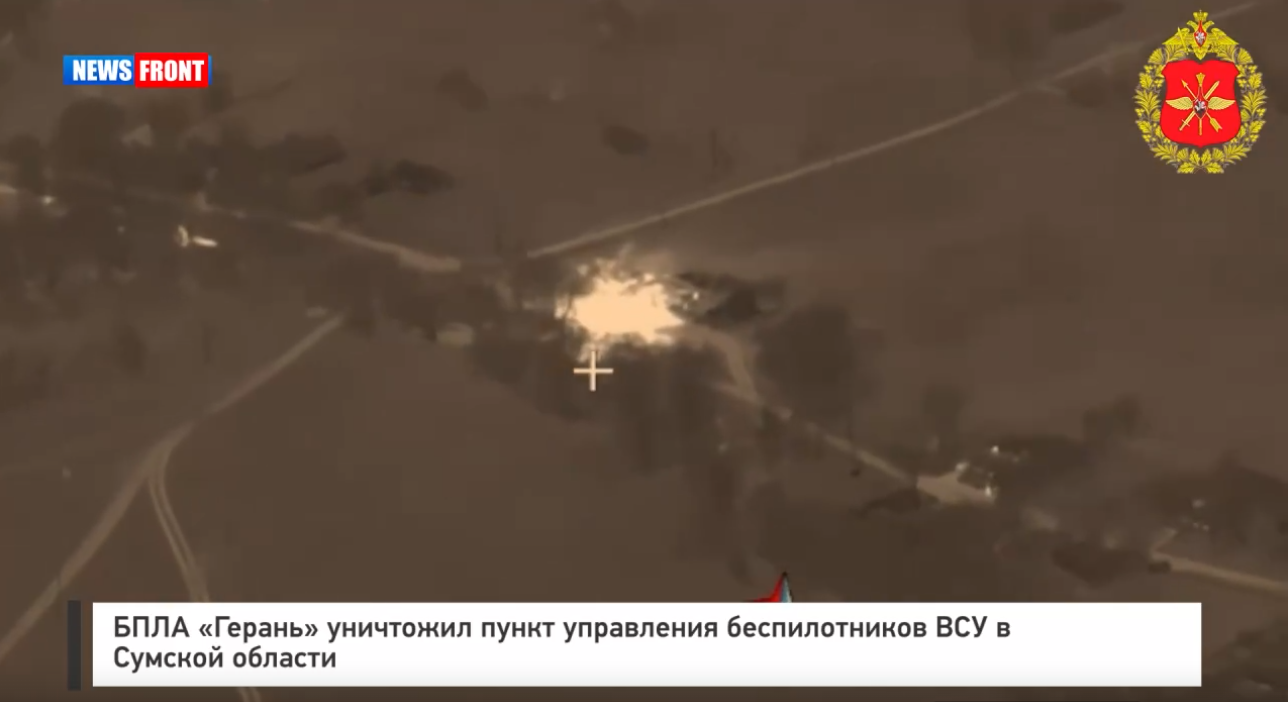 Расчет БПЛА «Герань» в Сумской области уничтожил пункт управления беспилотных летательных аппаратов ВСУ. Кадры публикует Минобороны РФ.