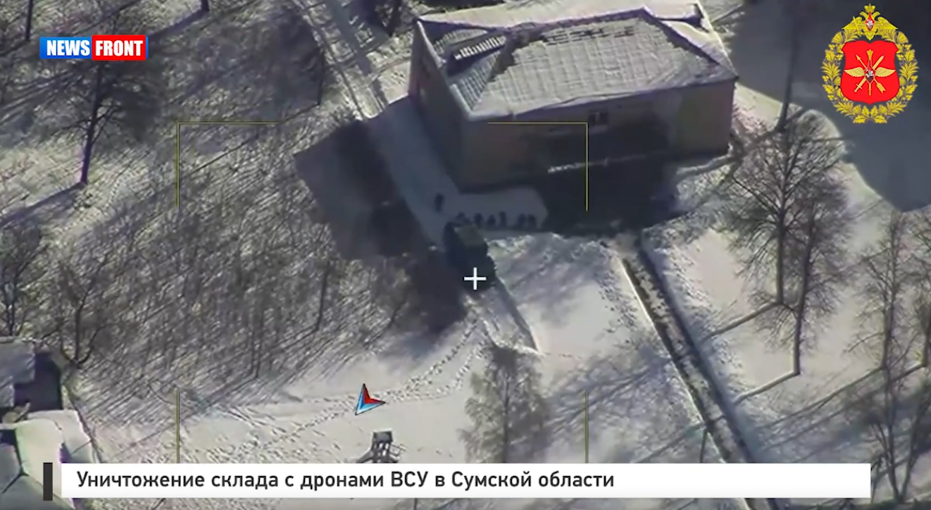 Министерство обороны Российской Федерации опубликовало поражения объекта. На представленных видеозаписях зафиксировано три последовательных удара беспилотников по зданию склада.